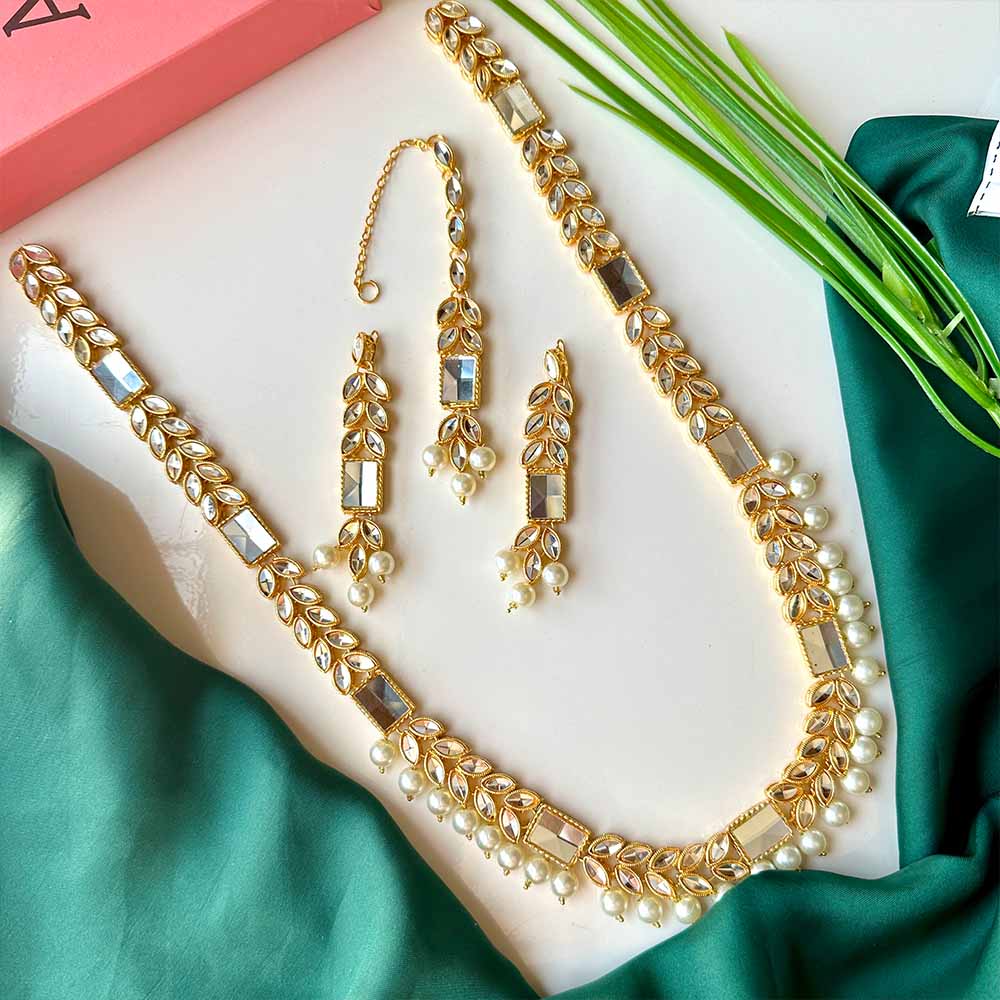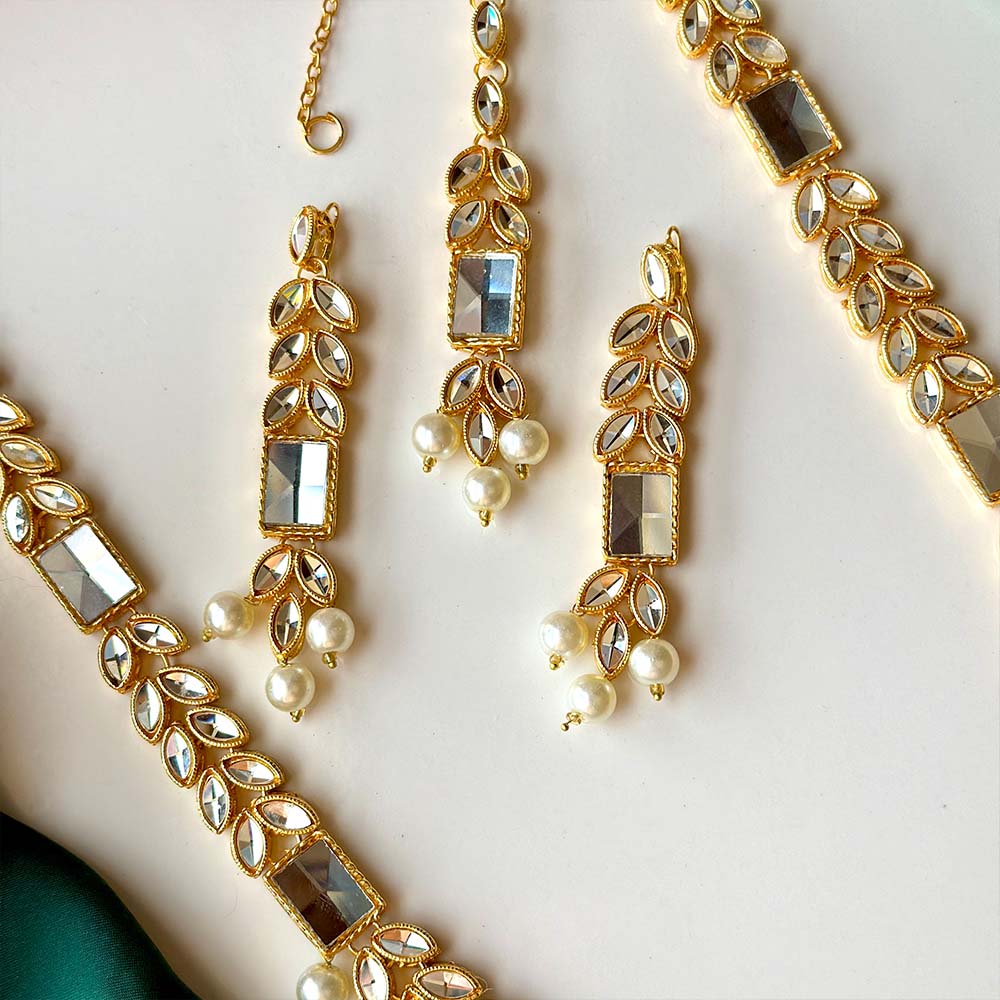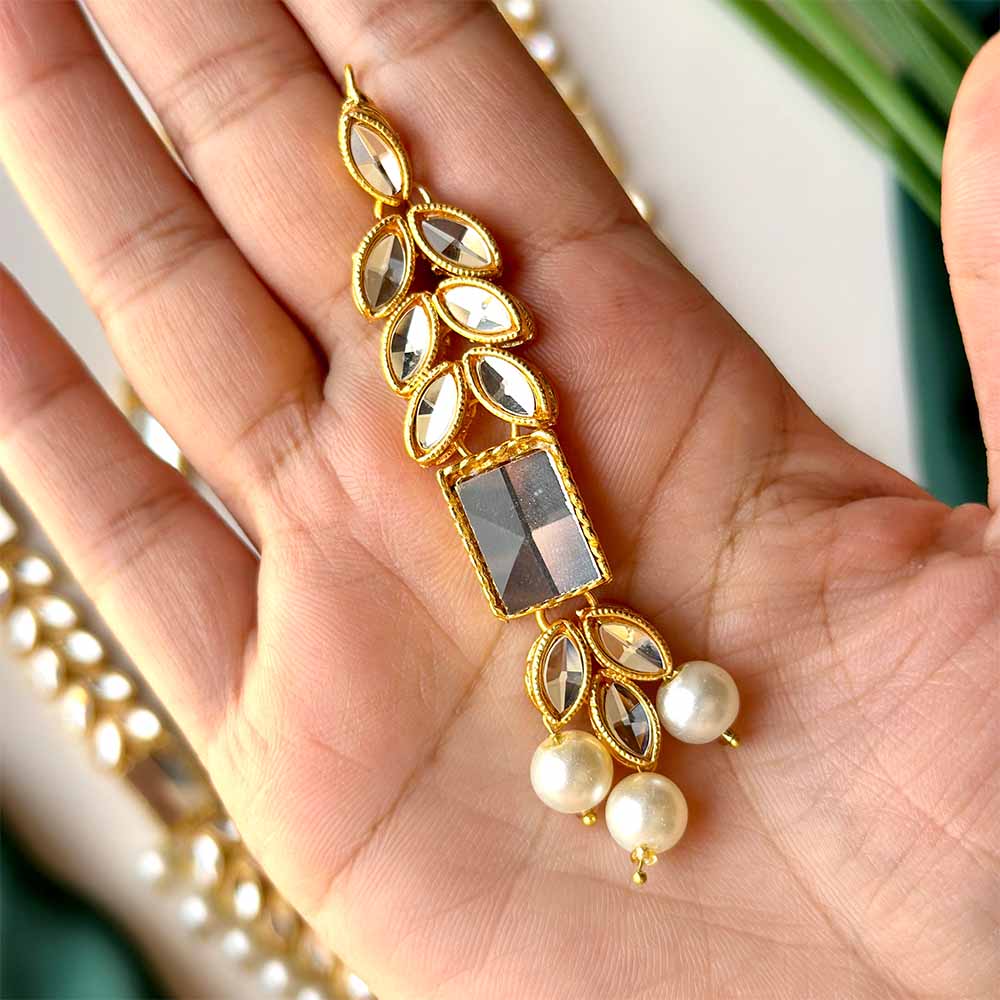 • Brass based maala, earrings and teeka with sheesha stones and pearl adornments.