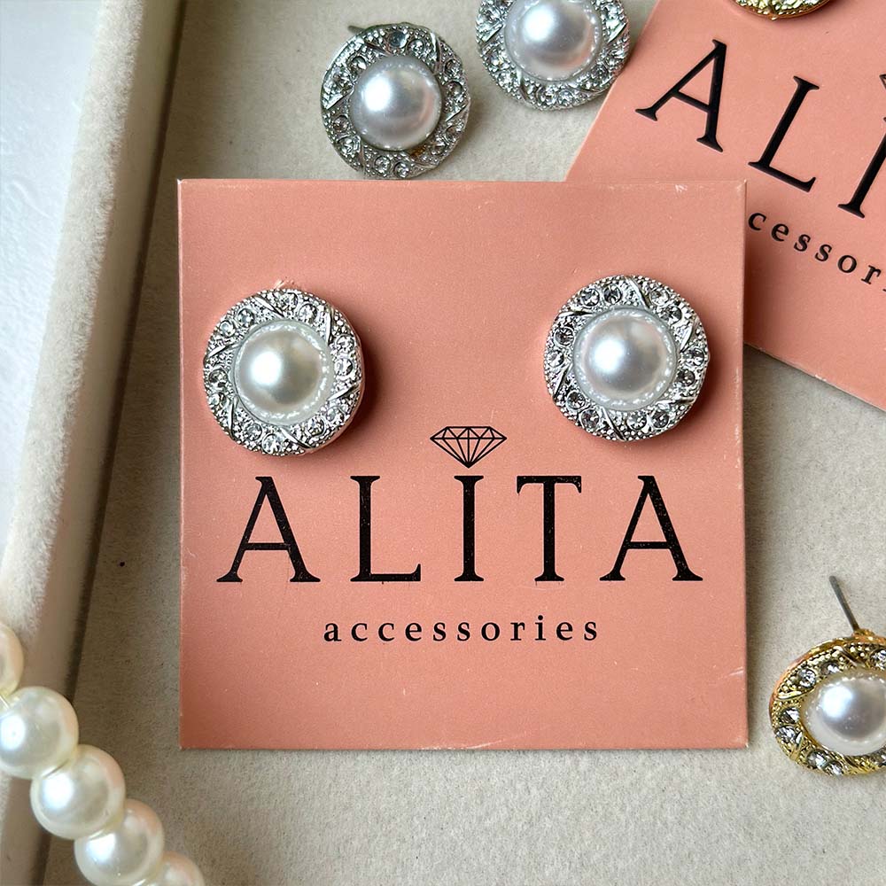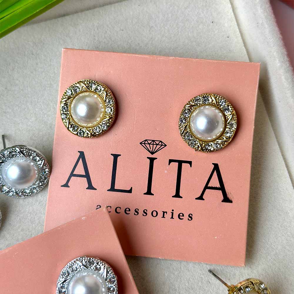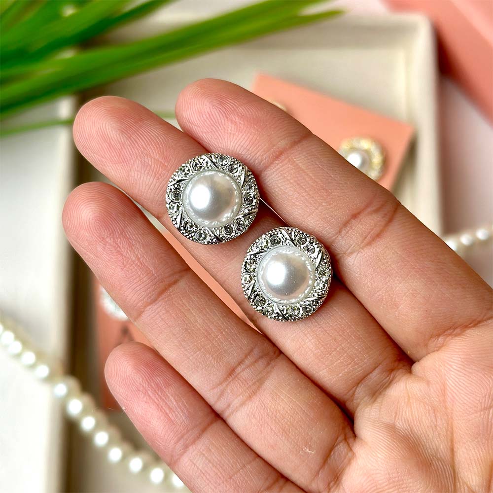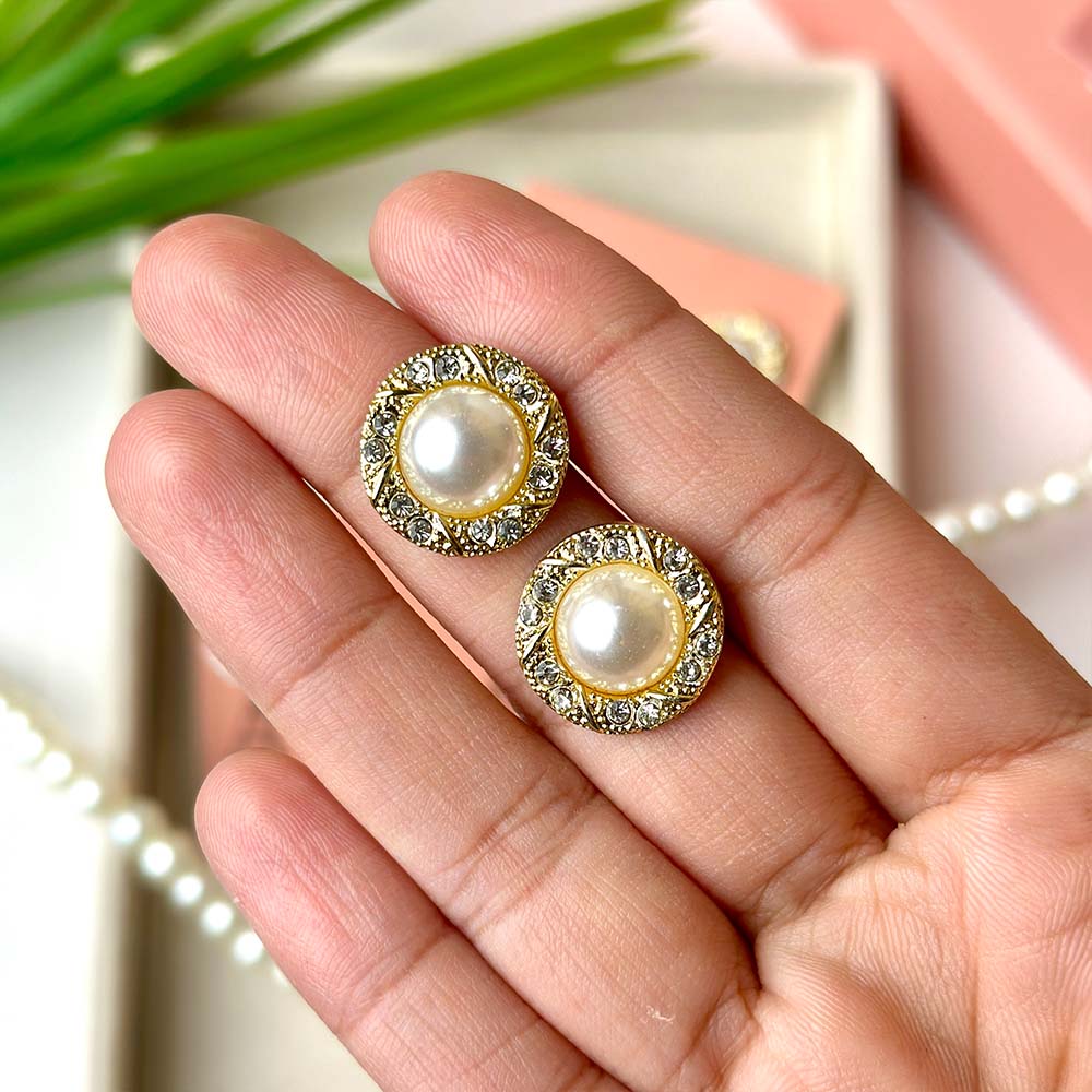 • Alloy based, color plated studs with a prominent pearl in the centre and small encrusted stones on sides.