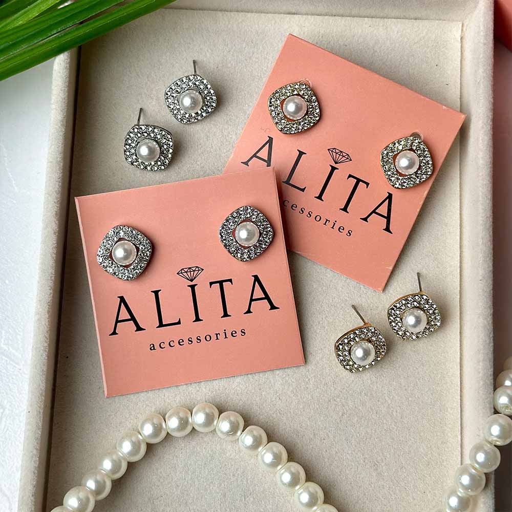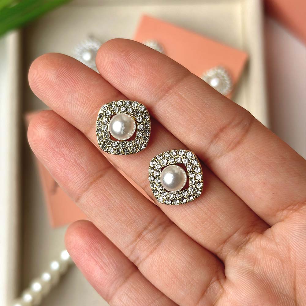 • Alloy based, color plated studs in golden ans silver with a prominent pearl in the centre and small encrusted stones on sides.
